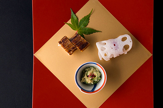 料理は年間を通じて季節ごとに大きく変わり、シーズン毎に前半・後半での献立変更も行っています。使用する食材は、日本海および瀬戸内海で獲れた新鮮な海の幸をはじめ、肉は岡山県産の「奈義牛」や、厳選されたA5ランクの和牛をメインに使用しています。