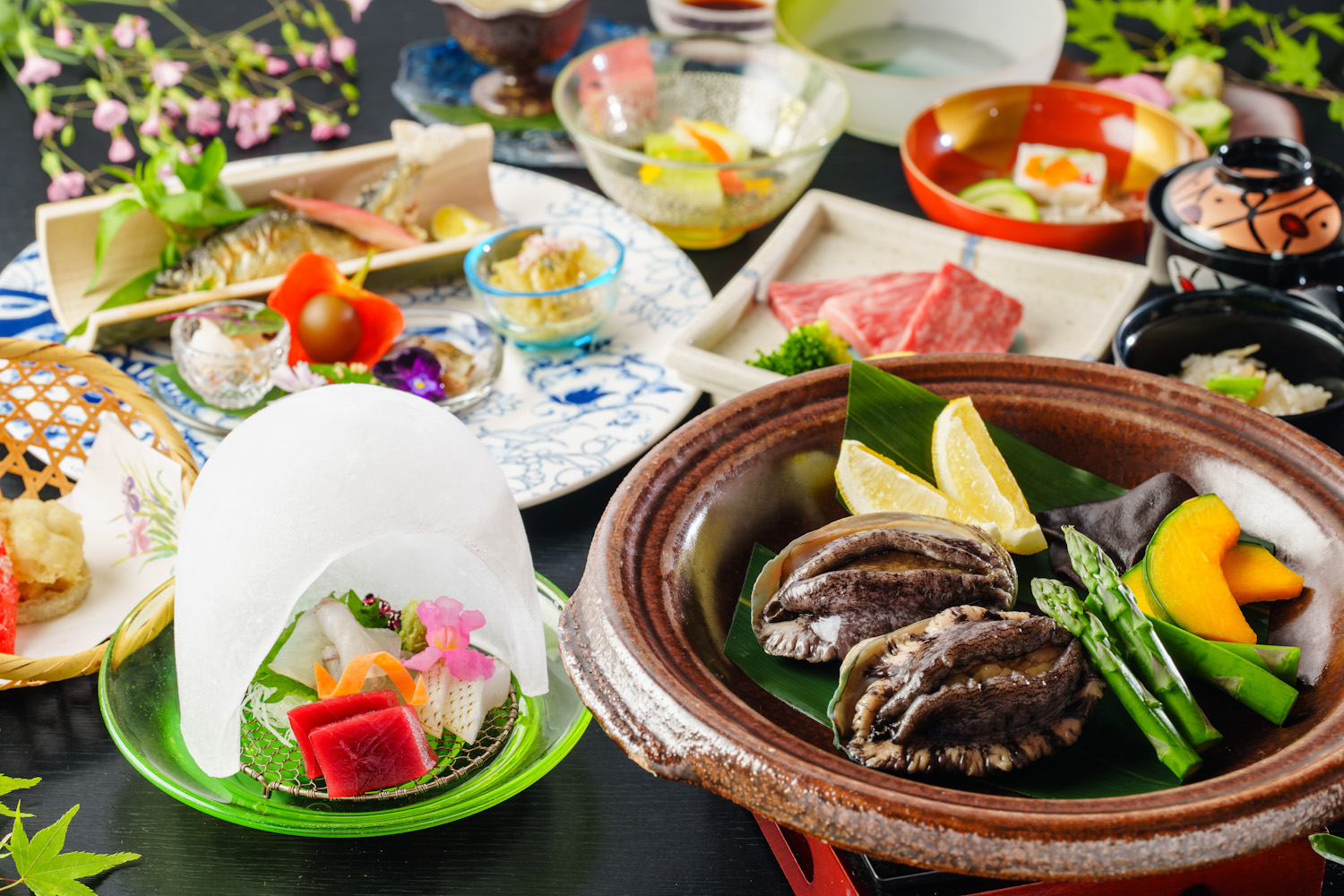 季譜の里の定番コース季節の花会席(基本プラン)。「季譜の里は初めて」という方におすすめの会席コースです。 やわらか鮑の蒸し焼きはもちろん、氷のドームのお造り、特選和牛の石焼き、鮎の塩焼きと山海の幸をバランスよくお召し上がりいただける内容です。